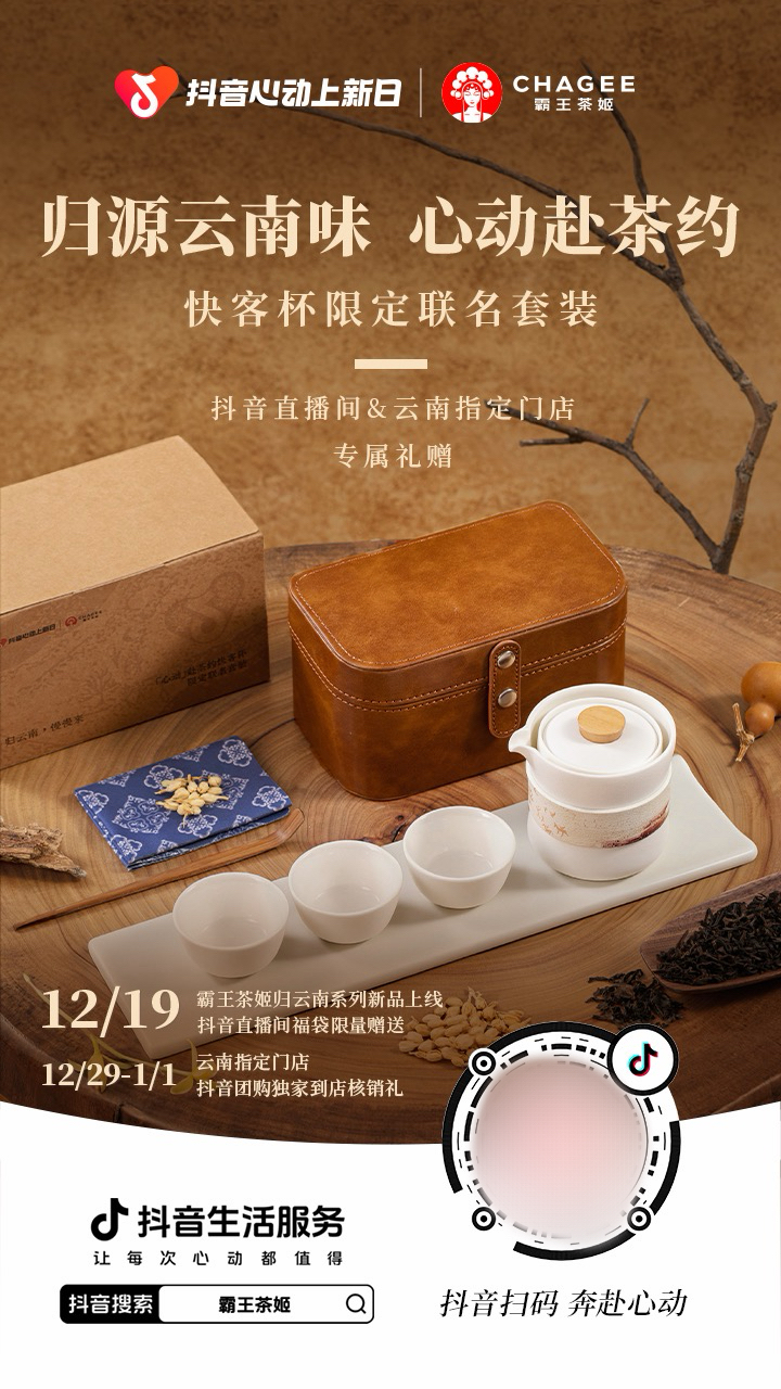 4.独家权益,锚定渠道心智: 为强化抖音渠道的专属价值与用户粘性,霸王茶姬首次与「抖音心动上新日」联合推出“归云南”定制限定周边。该系列周边作为直播间互动福袋,有效提升了用户停留与参与热情;同时作为线下核销的独家赠礼,它精巧地串联起“线上心动囤券-线下体验核销-收获惊喜纪念”的完整消费闭环,显著提升了抖音渠道券包的附加值与核销动力,强力塑造了“上抖音,囤霸王茶姬新品券”的用户习惯与渠道心智。